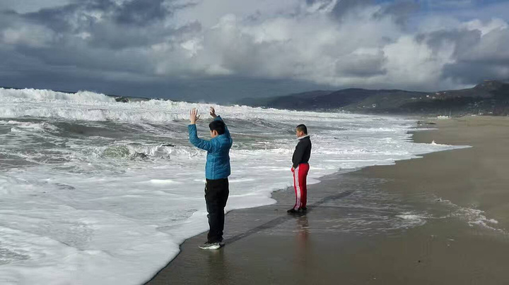 美西海岸大部分都是这种细沙,被海水浸润后坚硬如水泥,踩在上面不会下陷。孩子们追逐海浪嬉戏,玩得不亦乐乎。