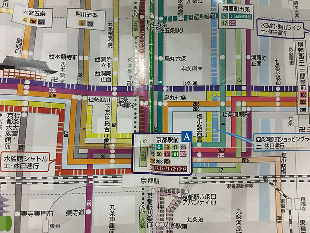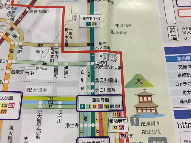 购买车票后,售票员会给你一张京都公车地图,比如我们要去银阁寺,我就找到“银阁寺前”或者“银阁寺道”哪路车到达,如下图,5,17,32,102,203,204还有100都可以到银阁寺。