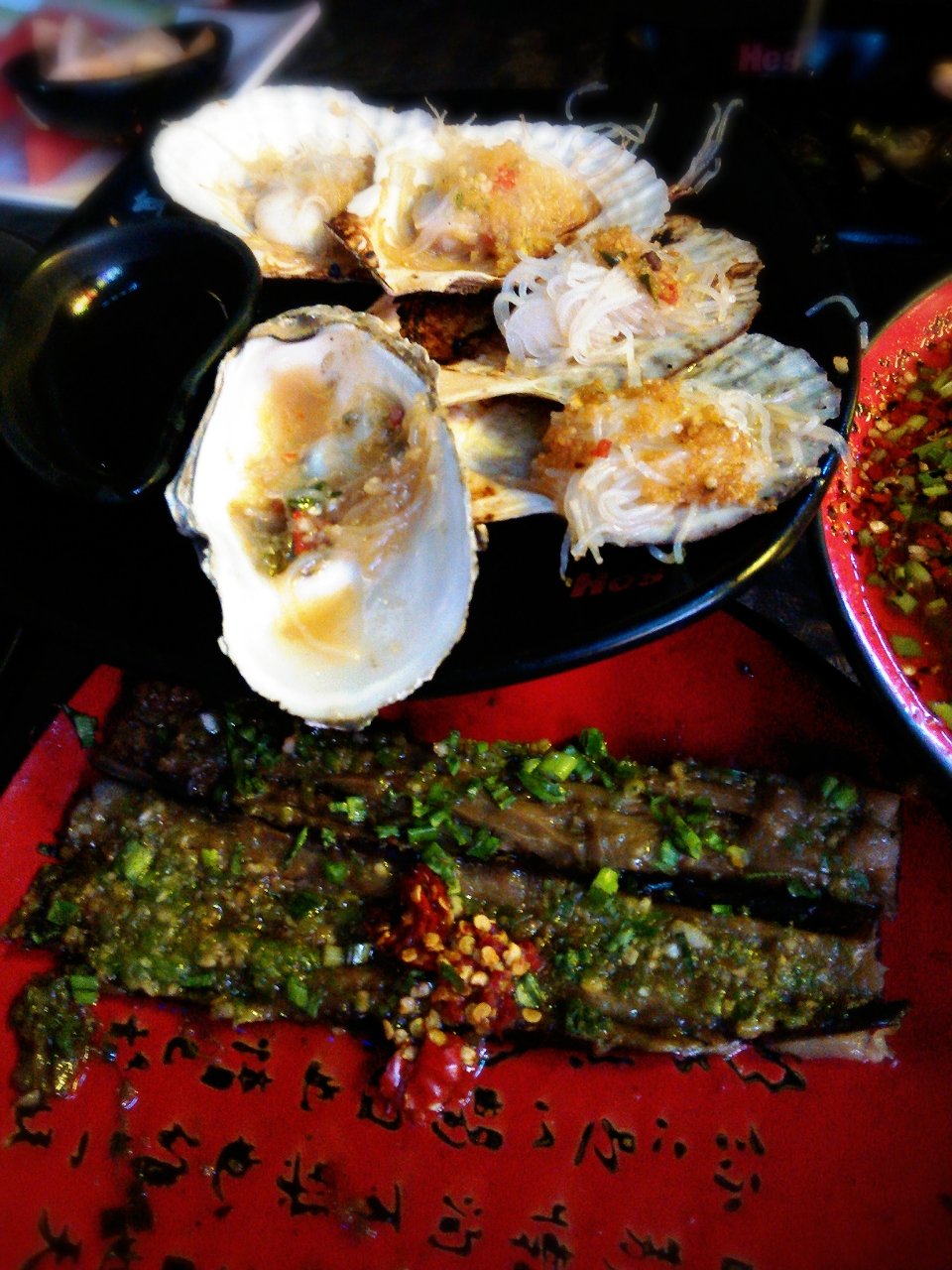 烤香蕉和泡椒猪脑,挺好吃的~非常显眼醒目的烧烤店……。至于猪腰子,吃不下去,那味道简直了……