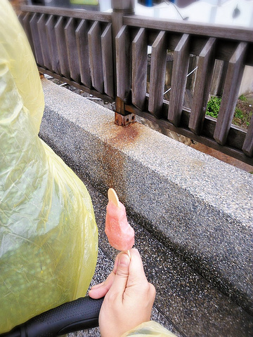 想起我在台北红楼买的明信片还没写,我们干脆在这写起了明信片,写完后一人挑了一种口味的果肉冰棒尝了尝。有百香果的,酸得直哆嗦,有释迦的,里边很多黑色的籽,吃起来硬硬的。我选择的是红心芭乐,不是很甜还有点粉粉的,吃起来就能感觉到这真是纯水果做成的,全是果肉,非常正宗。