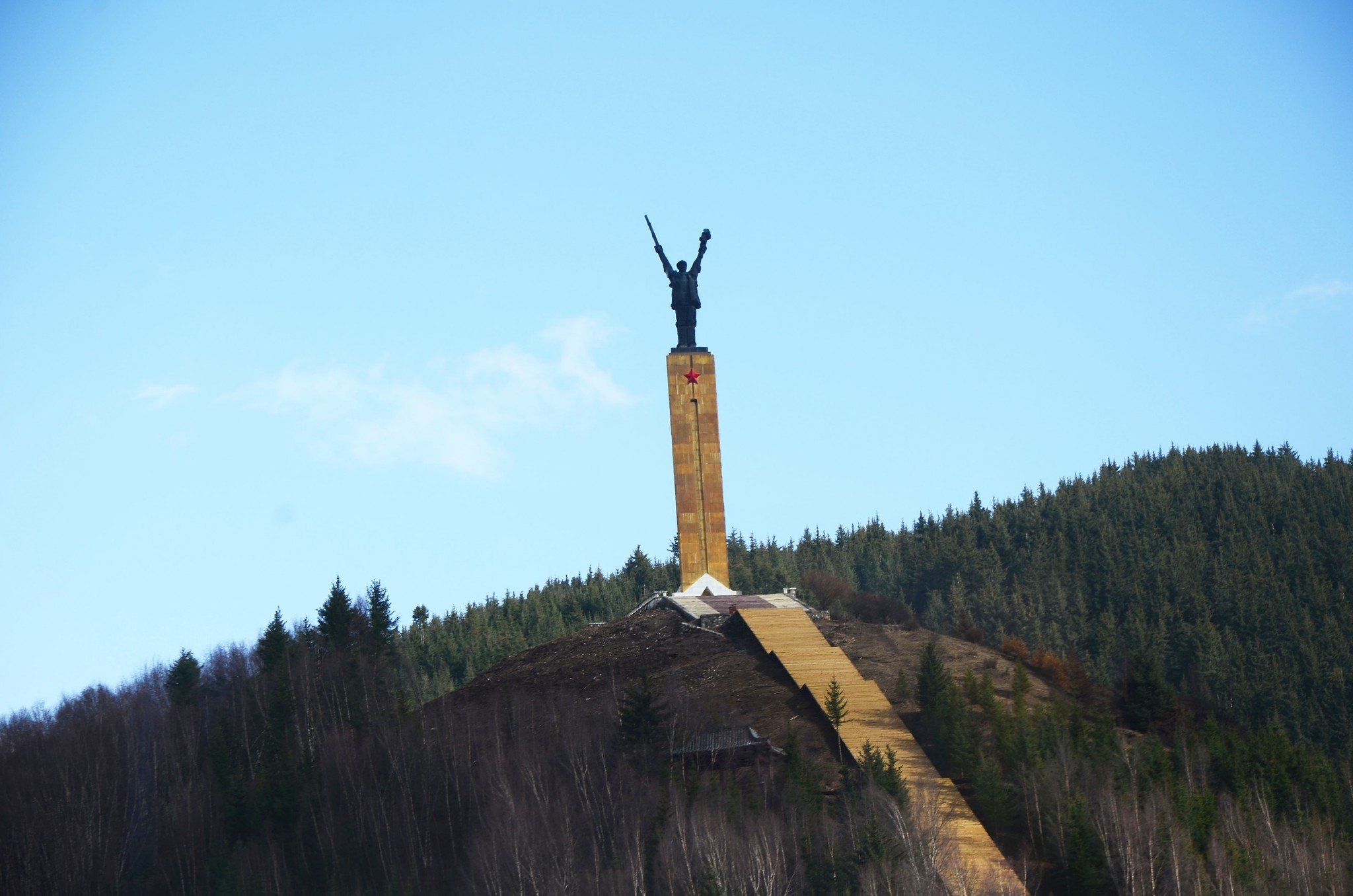 在大巴车上看到的一个纪念塔。导游说是纪念长征的。英雄一手拿着枪,一手拿着鲜花