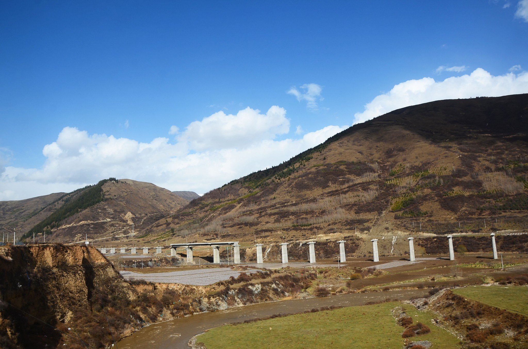 一排排桥墩犹如一条长龙盘旋在川西高原上。(后文摘自网络)正在修建的成兰铁路,是汶川特大地震灾后恢复重建重点交通基础设施建设项目。建成后,从成都坐火车到九寨后县只要2小时,到兰州只要4小时,将改变阿坝州无铁路的历史。设计得时速是200公里,属于中级快速铁路。