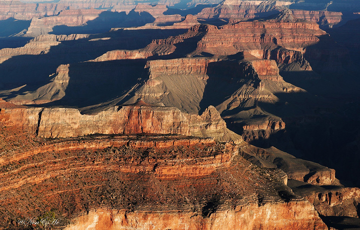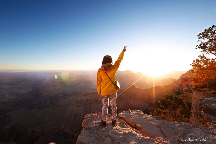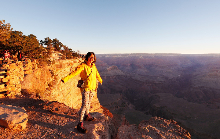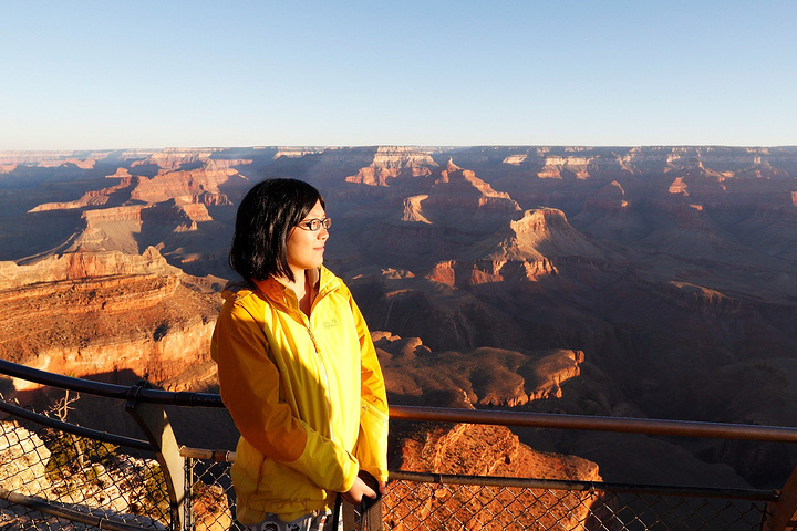 路线:大峡谷国家公园—马蹄湾 第二日是以橙线为主,主要观赏点: 1、Mother Point(单向) 2、Yavapai Point and Geology Museum(单向):亚瓦帕Yavapai Point位于大峡谷公园东侧,是观赏日出的最高点。旁边的亚瓦帕博特馆中还有大峡谷的立体模型,可以清楚地了解到大峡谷的全貌。 3、South Kaibab Trailhead(单向):来到大峡谷,必须要徒步一下,到大峡谷底(量力而为,但必须体验一番),比较有名的徒步线路,一条是蓝线的Bright Angel Trailhead,以及今日选择的橙线的South Kaibab Trailhead点。 4、Yaki Point(单向):很重要的一处景观、向下可以看到断崖上的游客和凝固的熔岩。 5、Pipe Creek Trailhead(单向) 6、返回Visitor Center(下午1点集合) 我的行程: A.Yavapai Point 4点就从酒店出发,开车半小时多到达日出点Yavapai Point的停车场,静等日出,日出十分美丽,可是我并没有选择最好的观测点,错过了最棒的,日出时大峡谷的变幻。