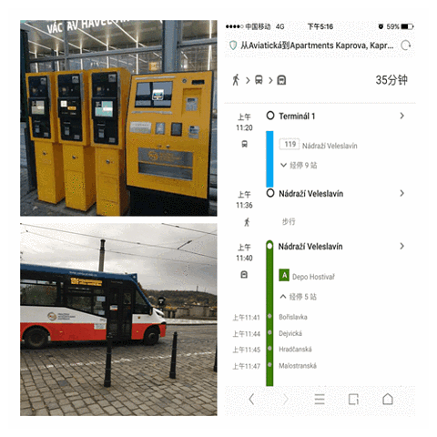 第一站目的地是酒店,我们需要把行李放回酒店。琪总从booking.com上订的酒店就在布拉格广场附近。在机场我们用谷歌地图查好路线,如右图所示,和百度地图的用法一模一样,甚至比百度地图更精确,所以谷歌地图是出行必不可少的软件。地图显示我们先坐119路公交,再换成地铁A线(布拉格地铁只有ABC三条线),35分钟就可以到达酒店。在机场的ATM机上用银联卡取了1000捷克克朗(相当于人民币二百多),准备用来坐公交。 机场门口就是公交站牌,黄色的机器就是自助售票机,我俩研究半天终于知道怎么操作了,但是发现机器只能接收100以下面额的捷克克朗,而我俩取的是一张1000面额的克朗。无奈我俩硬着头皮问了旁边一同等车的捷克女孩,女孩非常热情也非常聪明的明白了我们的需求,她看见我手上还有小额的欧元,说可以用克朗换我们的欧元,于是,我们成功的换到了小额克朗,顺利买到了公交票。 欧洲的公交票大部分是以时间计算的,比如你可以买30分钟、90分钟或者更长时间的票,在有效时间内可以换成任何公交。我们各买了一张90分钟的票,花了32克朗(¥7块多)。