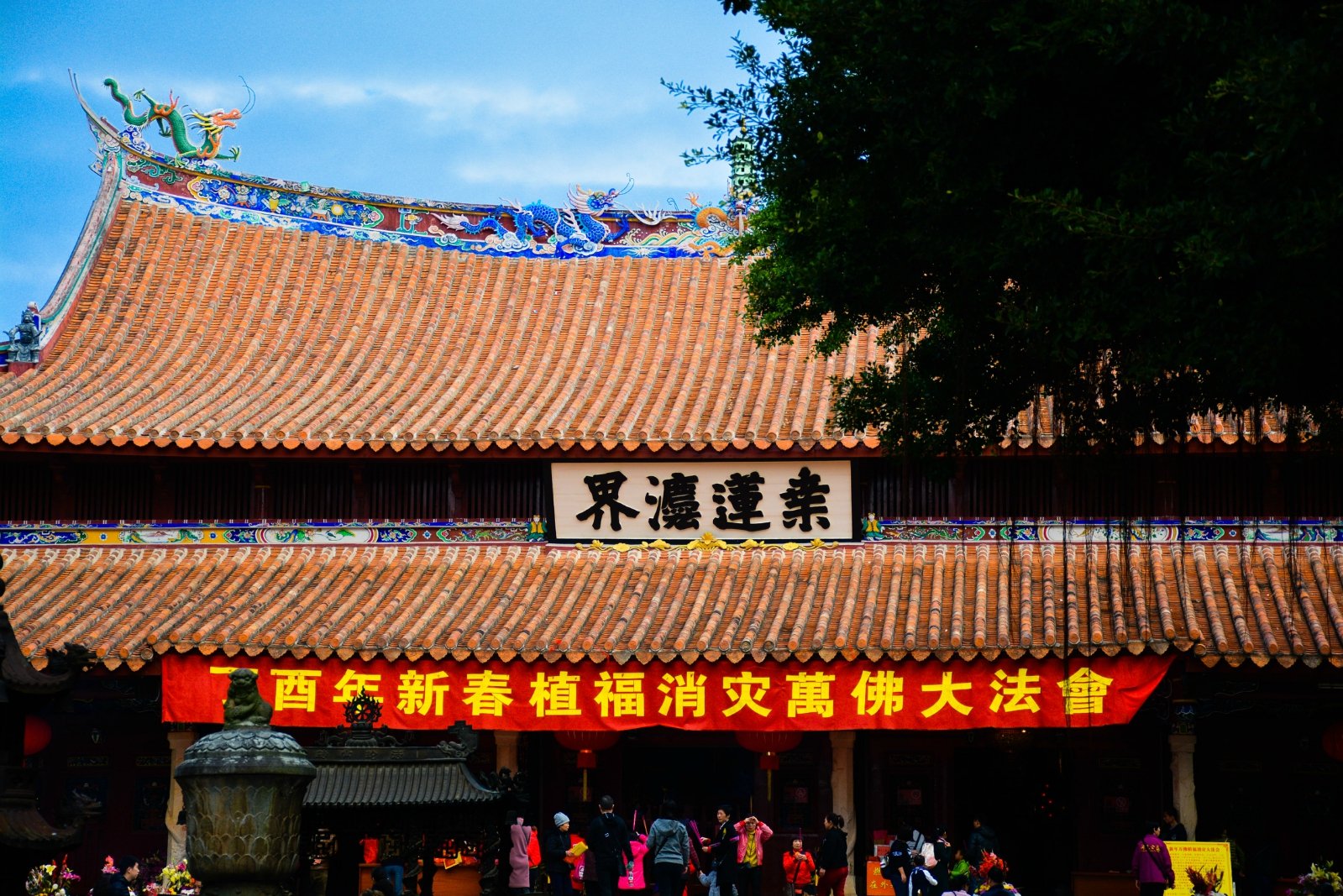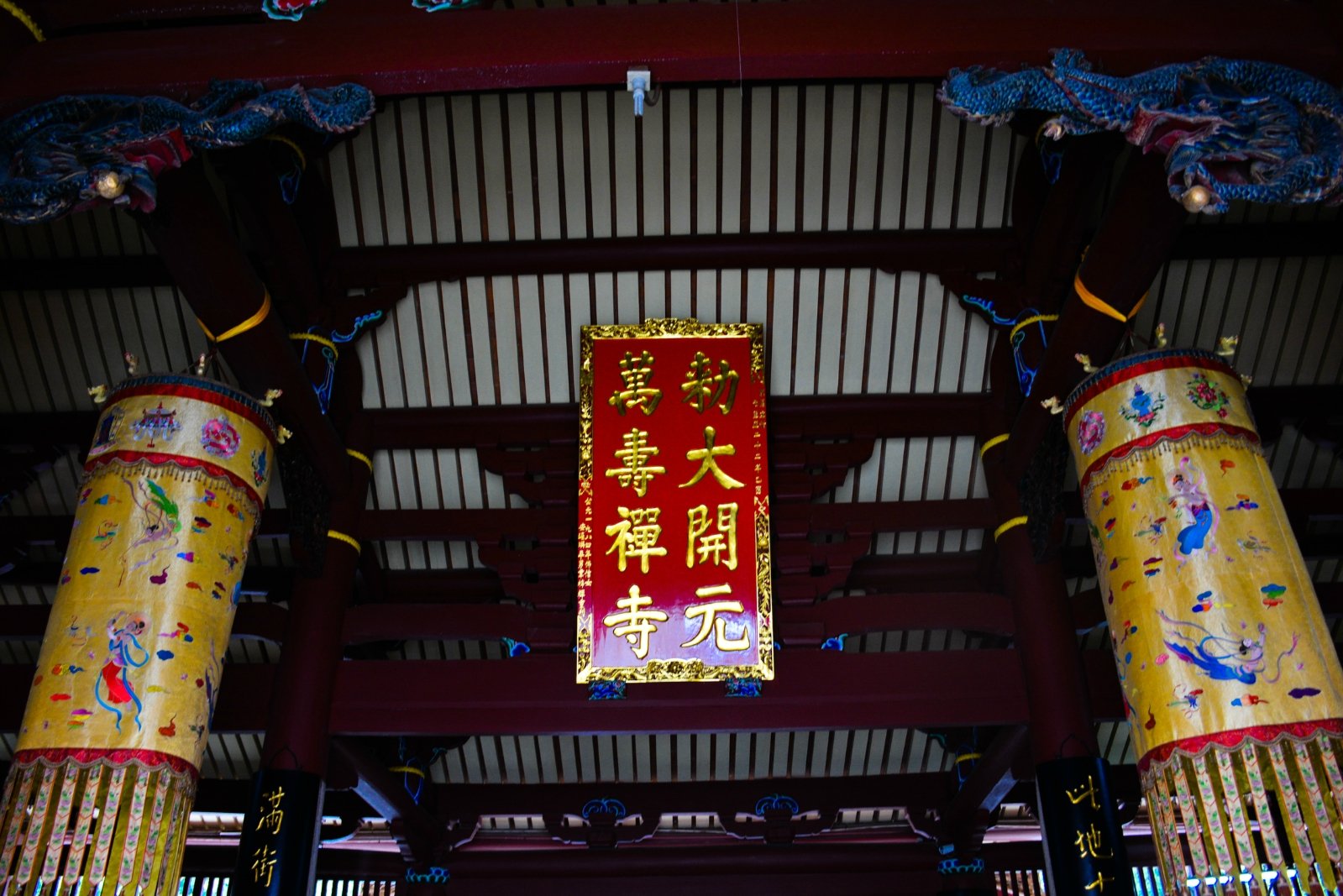 走进山门,可见其上悬挂着“勅大开元,万寿禅寺”,殿内石柱为梭柱,石柱上有对联“此地古称佛国,满街都是圣人”,是朱熹所撰,由弘一法师所书。泉南佛国的底蕴一下就显现出来。