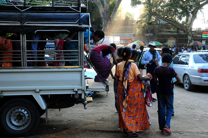 在缅甸,这种小型货车放上两排长条凳就算是出租车了,通常这样一辆车可以装下二十几个人,站的、坐的。蹲的,塞得满满的。