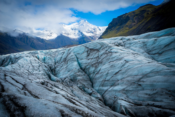 阳光下的冰川自里向外透着一抹纯净的蓝 上面黑色的纹路多是火山灰