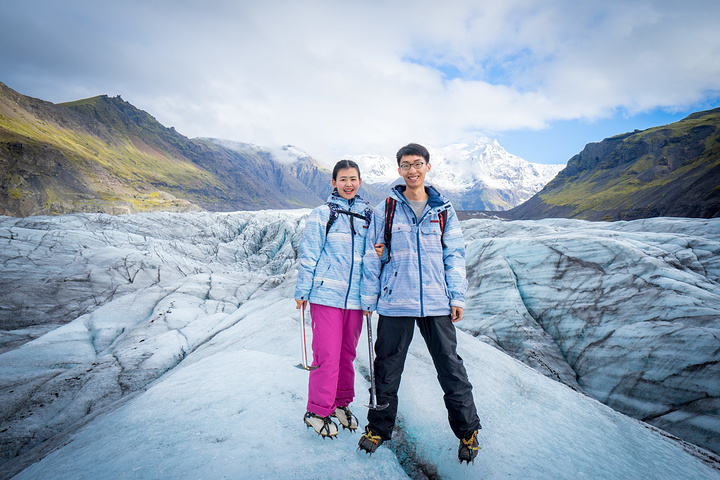 因为参照了不少有冰川徒步的攻略 以为冰川徒步是一项危险系数很高的活动 体验了之后发现有点多虑了 明明是一项老少皆宜十分有趣的活动好不好! 我们的向导是个妹子 会检查你穿的鞋子 如果不是厚底登山靴会建议你租鞋 事实证明一般登山鞋也是可以的 徒步是包含冰爪的 所以不用托运冰爪过去 冰爪的穿戴向导会教的很耐心 因为的确是一项很重要的安全保障 一旦掌握了冰爪的使用 在冰川上行走甚至小跑还是很轻松的 当然要注意不能踩水坑 因为很可能是深不见底的冰洞 而且两个小时的难度不大的冰川徒步体验 是包括很多讲解和趣味活动的 并不是直白的翻译成“徒步”就能囊括的 我们的向导妹子就讲了一个点不太合口味的冰川故事 冰川的现状和发展 还有一些个有的没的 所以两个小时并不全在深入冰川 而且冰川是不断向下运动的 不一定每一次都会选到深入的路 所以看的更多的办法只能是 延长时间了吧 反正我下次要去4小时纯徒步的我不管