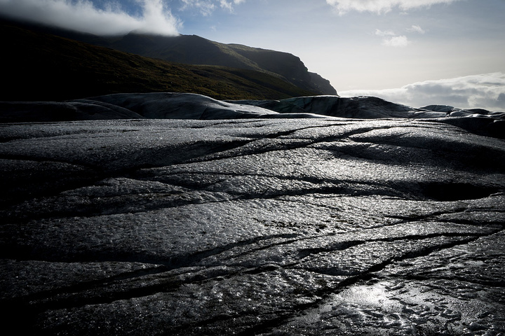 而靠近冰川外源的冰 因为不停的向土地延伸 所以覆盖了火山灰变成了外形表面样油亮的黑色