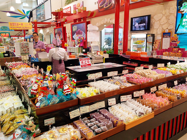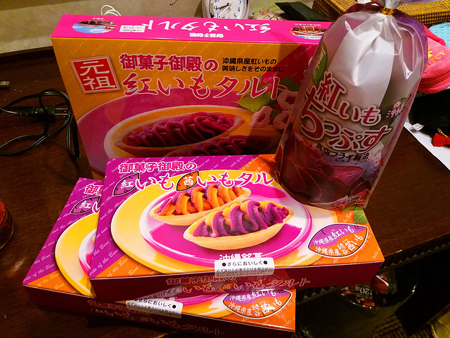 一日游唯一的一个购物点哟 没有强行购买的意思 一切随意 卖的基本就是冲绳的特产 紫薯泥蛋挞了 这次还买到了双色紫薯泥蛋挞 好好吃呀 价格有点小贵 导游小姐会发券 每个消费的顾客都会送你一份小食 胡麻饼干还挺好吃的 在这里一次性采购也不错 买满可以免税的噢 买满3000日币还可以送美貌的购物袋