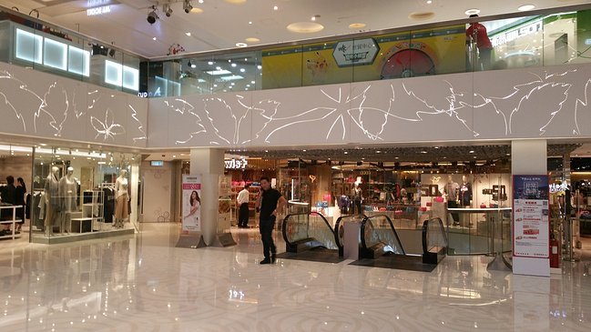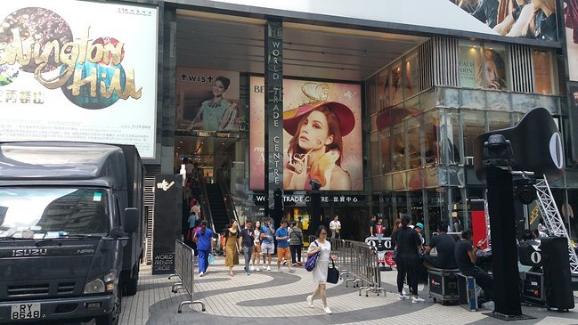 这里就是铜锣湾世贸中心,看到下图居中偏左的自动扶梯了没? 你只管朝面包车方向一直往前走就行