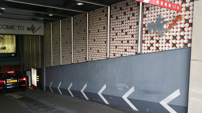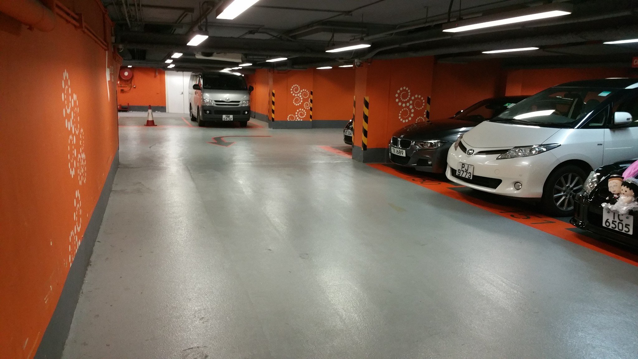 进入停车场后,立刻左转,你就会看到下面这个场景 —— 见到下图中的面包车了没(车头前还有一个拐弯的指示箭头)?