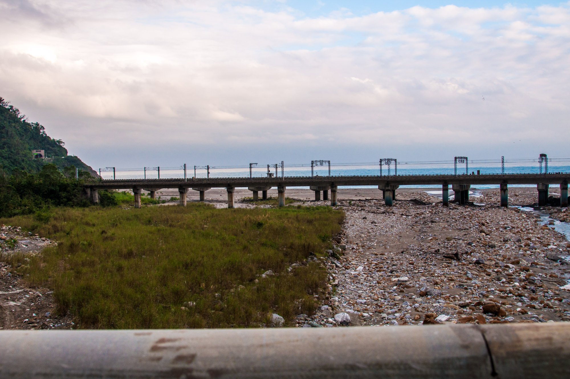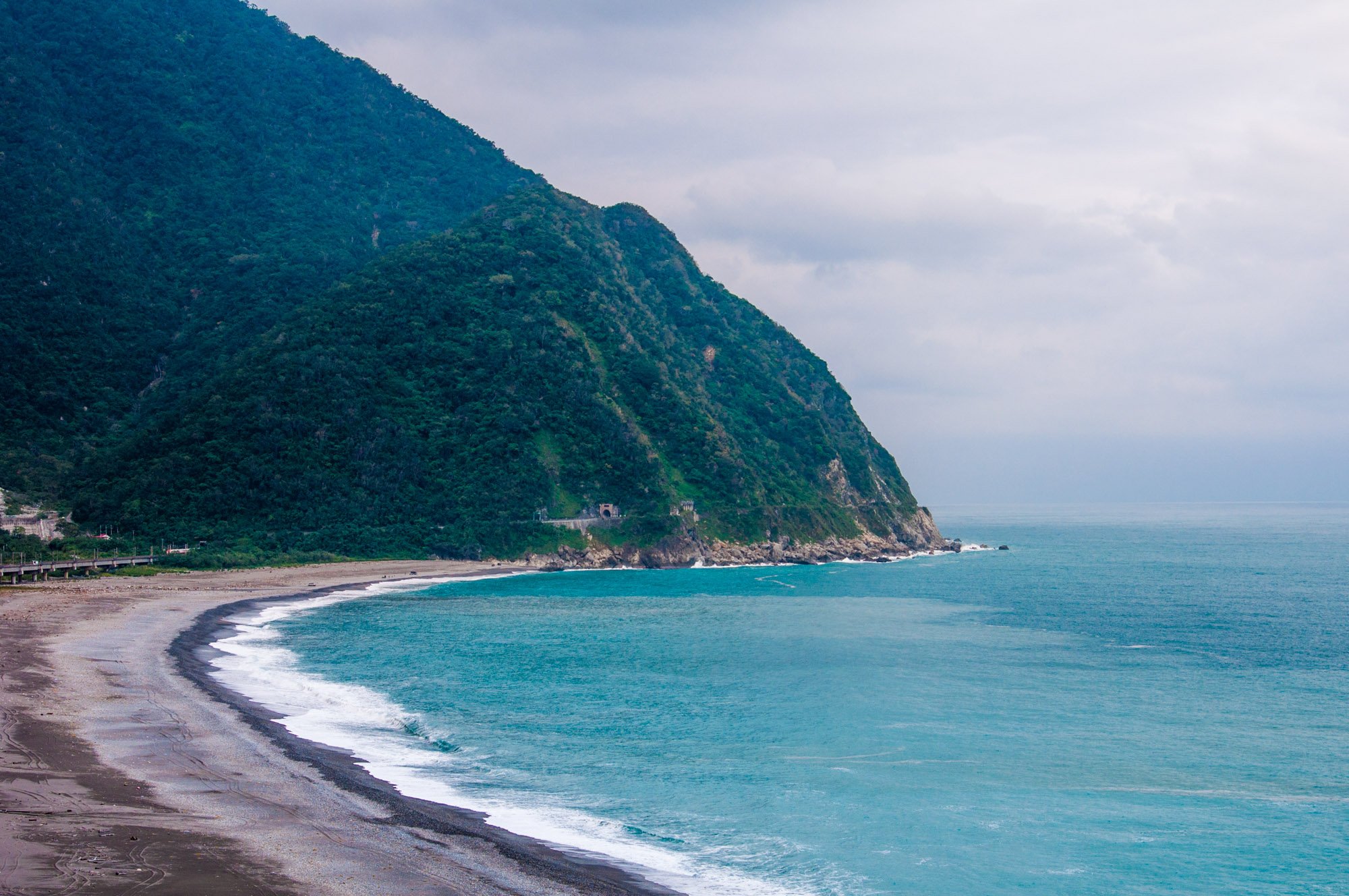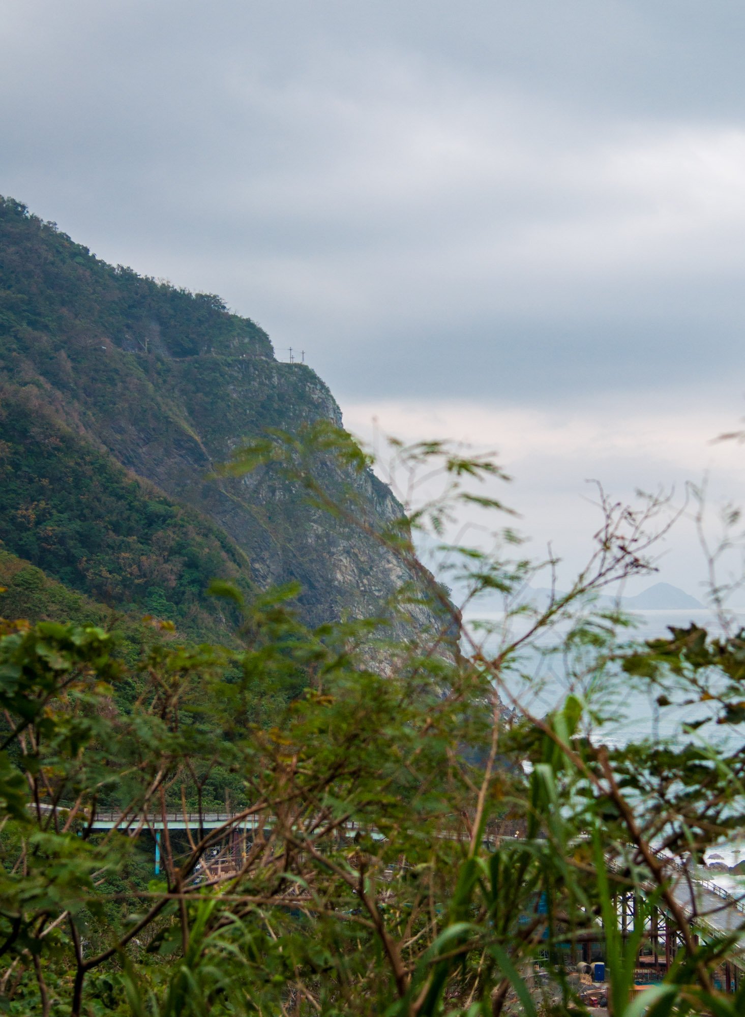 铁路消失在山脚下,应该是穿山而过了,而公路依然是在山崖上沿海而行。