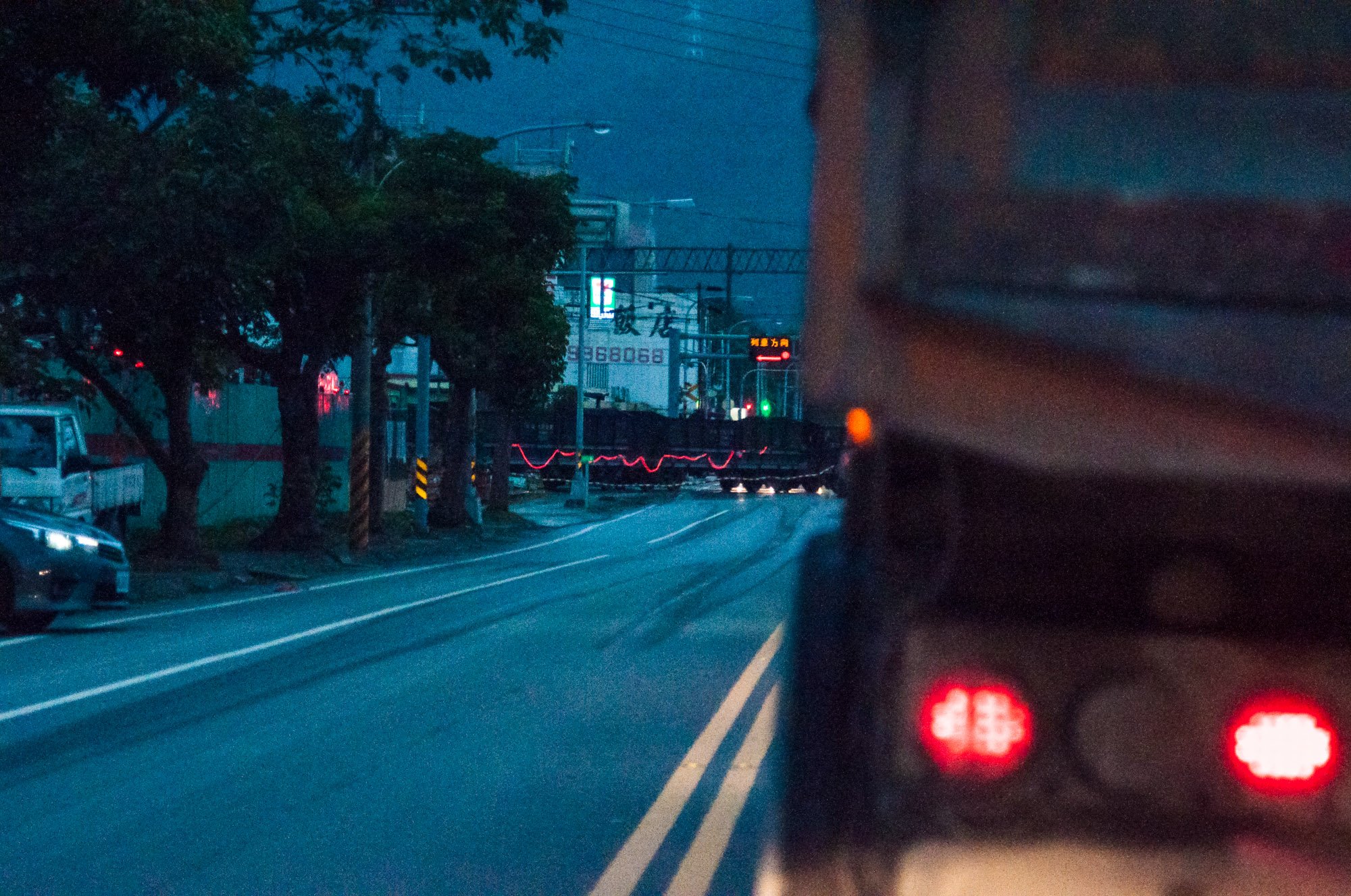 前方火车通过,利用停车让行的功夫休息一下,照片被我提亮了许多,当时的火车只能隐约看清轮廓。