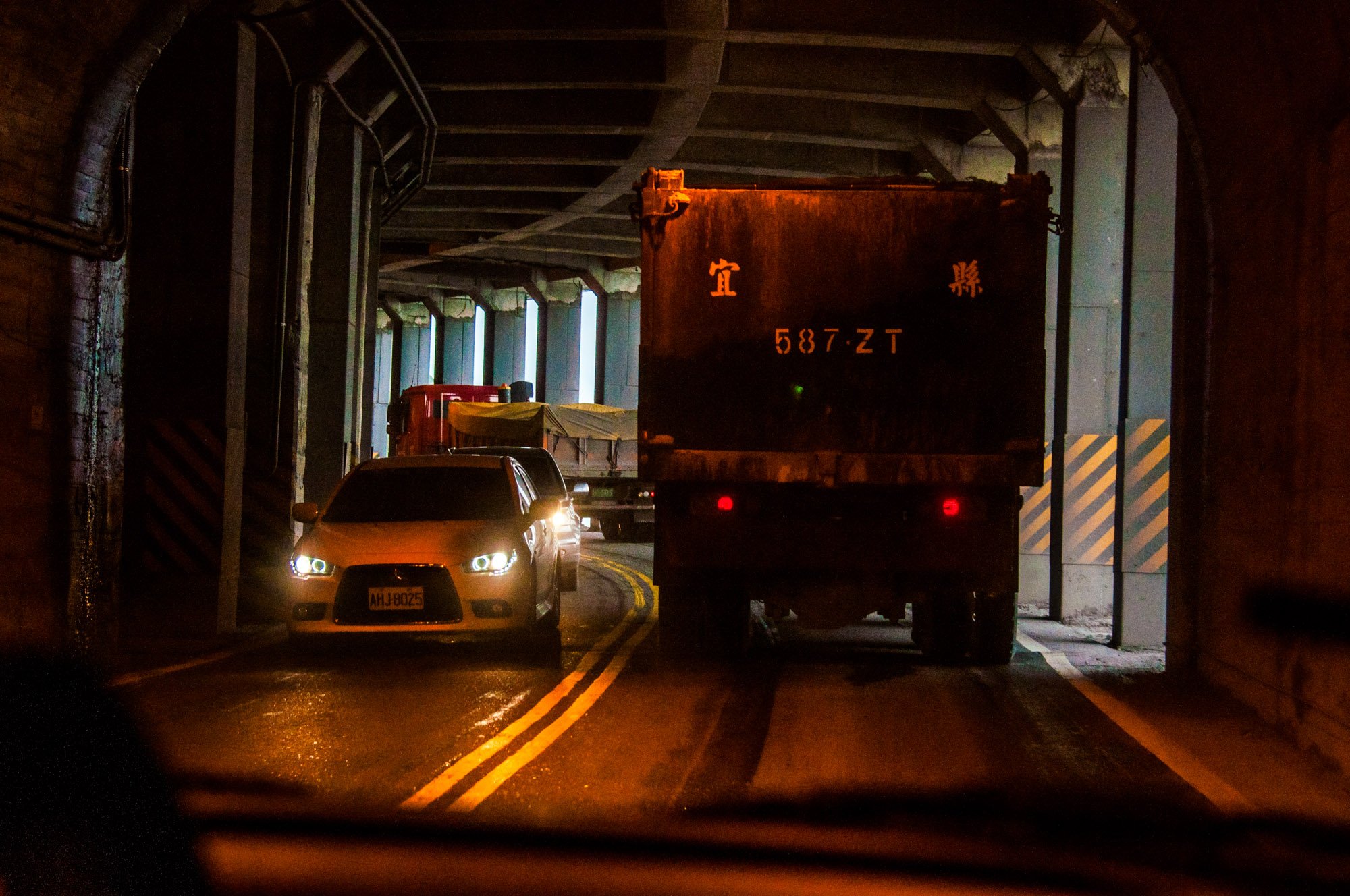 我实在是不愿意做头车,黑乎乎的山路需要不停地的变换远近光灯给地貌增加立体感,除了要仔细辨别每一个转弯还要不停摇摆脑袋躲避后视镜中的灯光干扰。没办法,我是第一次走苏花,安全第一,只能尽量压低车速。