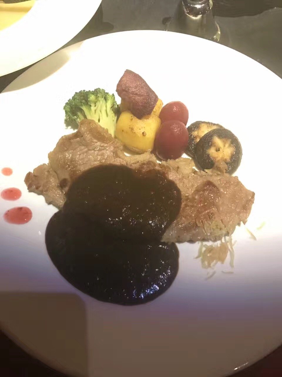 牛排的卖相就很一般,而且我们点的五分熟,但是出来感觉也太老了,而且黑椒汁直接淋在了上面,总之师傅的手艺还要加强,不能只吃环境嘛,口感也很重要。