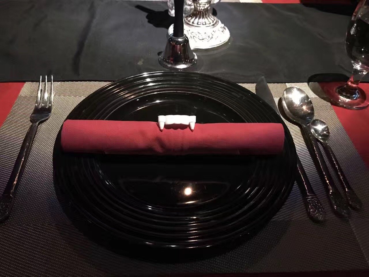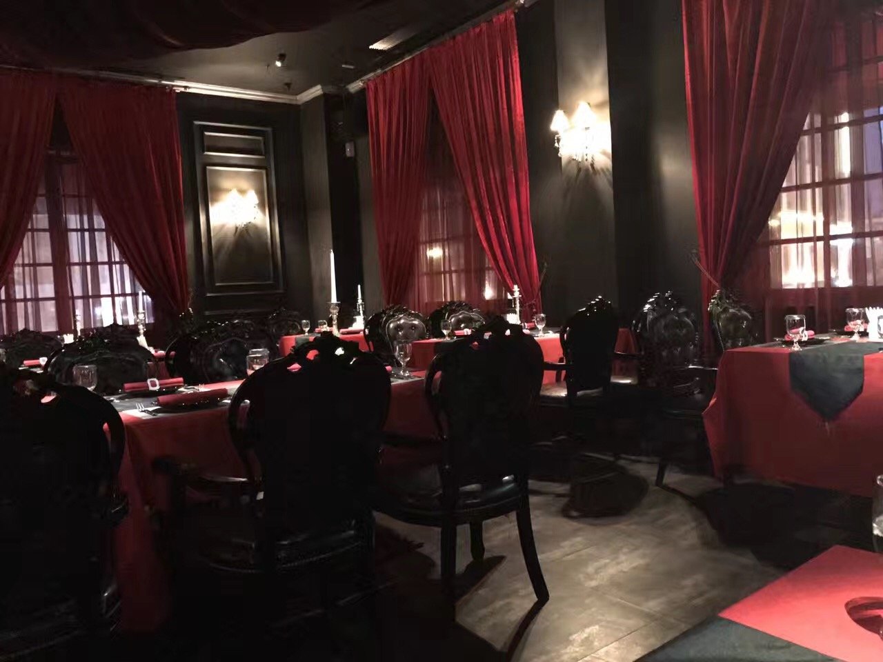 餐厅环境布置还是非常有亮点的,整体一进去就让人非常的压抑,因为装修的灯光很昏暗,主色调也是深红和黑色的。所以来此用此还是要有一定心理准备了,尤其是第一次约会的或者两人关系有多好的要考验一下。服务员的服饰也很有特色,黑色的衣服,感觉在这儿用餐要是之前很喜欢吸血鬼的电影或者小说会更融入这样的氛围。