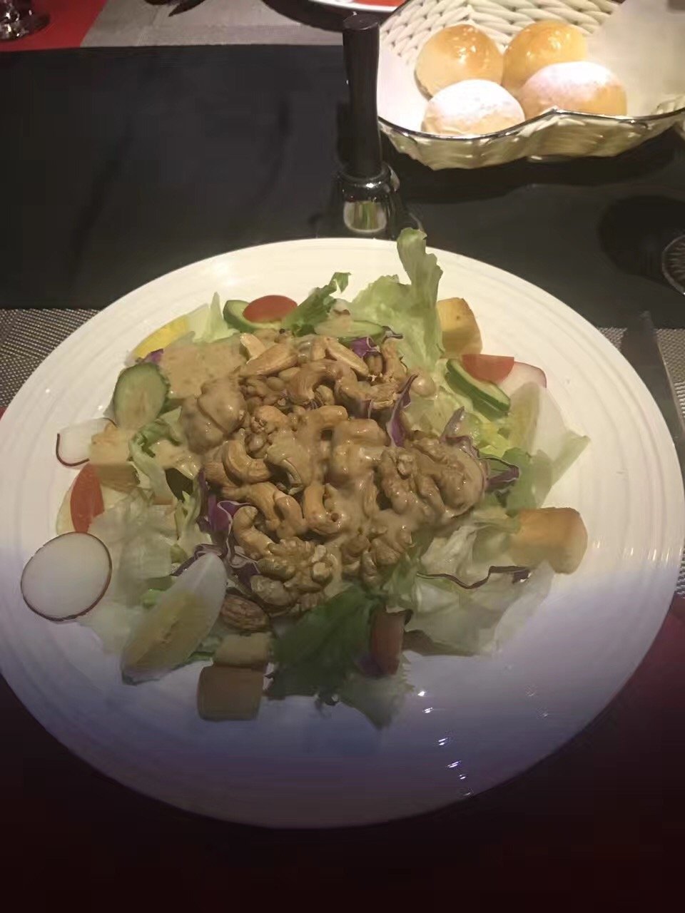 这家的环境不错,但是菜品着实没有太多的惊艳值得我们回味和评价,像蔬菜沙拉,基本感觉是在吃腰果配色拉酱。加上店里的灯光实在太幽暗,拍照怎么拍都不能拍出美感。