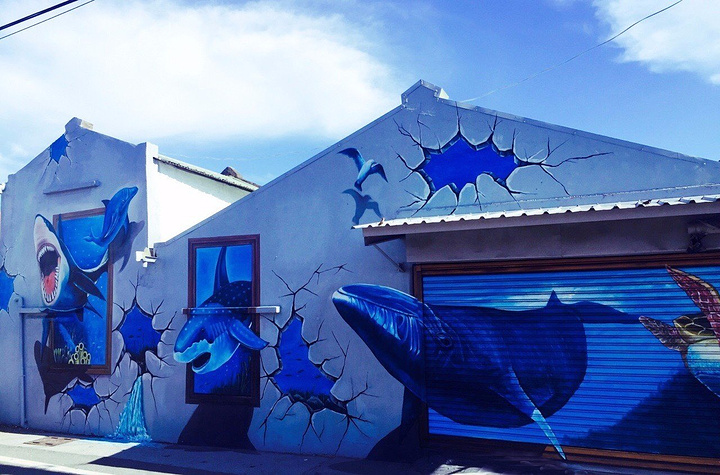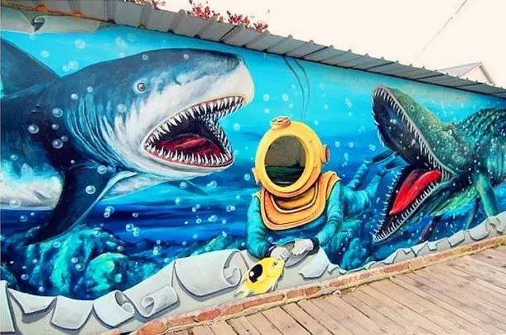 你以为自己身处大海,不过是躺在好美里彩绘村的地板上 哗!张开血盆大口,海底霸者的鲨鱼冲破围墙,朝着路上的你“疯狂”袭来,全台湾首创的立体绘画便在好美里彩绘村,刺激的海底世界正欢迎我们去探索。