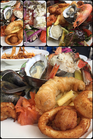 大洋路: 1. The Pier Restaurant(洛恩栈桥边) 特色:生蚝,两份海鲜拼盘78澳,生蚝15元一打。 大洋路上洛恩栈桥边的餐厅,这家餐厅是看过攻略后专程前往的,驴友们建议只点海鲜拼盘,里面的虾蟹很新鲜,可能是国人来这里都只点这道餐点,现在店主要求按人头点餐,不允许只点海鲜拼盘,我们不得不点了4份主食,对于不愿生吃海鲜的人来说,这个有些难以接受,生蚝和青口全是生的。