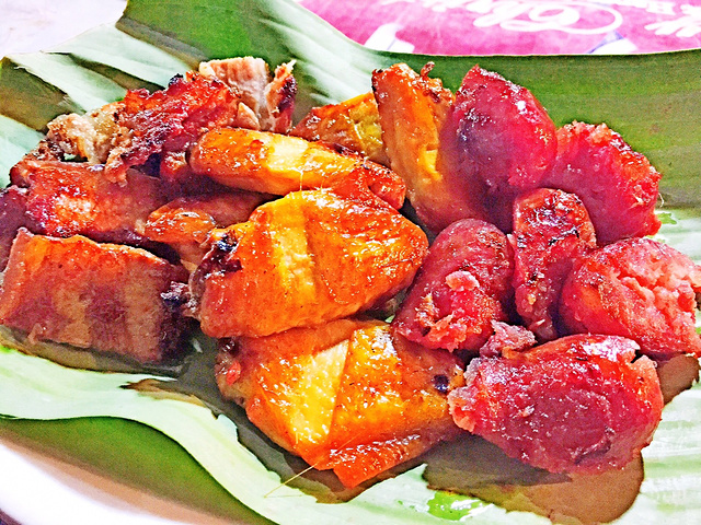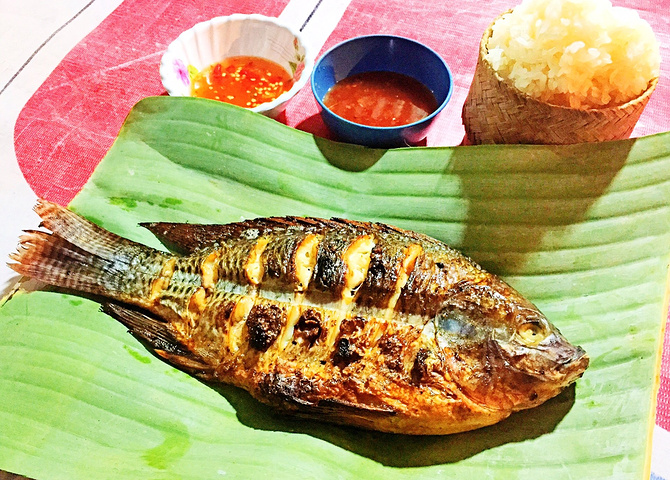琅勃拉邦夜市据说是琅勃拉邦旅游的最大亮点之一,每天傍晚时分上百家摊位沿着The Sisavangvong大街一字排开纷纷售卖丝巾,鞋子,衣服,手工灯罩,环保纸灯,笔记本,银器和各种手工艺品。首先怎么着也得先把肚子填饱才有力气杀价啊,琅勃拉邦夜市是有专门食物区的,素食自助、烧烤、麻辣烫、粉和各类小吃应有尽有,每桌几乎都有beerlao,环境真心不要指望,连大排档都算不上,没坐垃圾堆里吃就算不错的,素食自助觉得卖相比较有特色,每人15000基普,但我真心吃不下,外国人怎么能吃那么香呢。溜达一圈加上食肉动物的本性,最后决定吃烧烤,烤鱼说是一定要吃的,虽然不好看,20000基普的罗非鱼加上特定香料烹制的味道还是不错的,其他就看个人爱好了,不过很多鸡皮和鸡屁股可以选,哈哈,口味有点重,红色小圆肠和鸡翅挺好吃的,长期在外的我们没有办法天天吃草,在对面麻辣烫摊叫了不少蔬菜来烫,重复利用的红汤锅底真心辣喉咙。除了享誉全球的beerlao,身份证上还是female的我好像更喜欢市场上的各种shake,均价大概10000基普一杯,不要在意menu上的那些细节,just follow your heart,没有做不出的口味,只有想不出的idea,好吗,小伙伴也不知道哪里看的攻略说是有翔之称的咖啡火龙果奶昔,其实还好,曾经点过一杯薄荷加柠檬加姜加咖啡加巧克力加火龙果加香蕉加奥利奥等的奇葩奶昔,杯同其翔,老挝妹纸都惊呆啦,就是这样随心所欲的搭配,每天不吃饭也会来上好几杯,但是后来听说做shake的冰很多都是工业冰,许久不化,有点想起了天朝的皮鞋老酸奶,特别慎。另外,超级推荐路边的椰子蛋糕和夜市边四层楼咖啡厅的点心,虽然很小一块均价在15000基普,但口感真的细腻丰富,物有所值,各种布朗尼真赞。