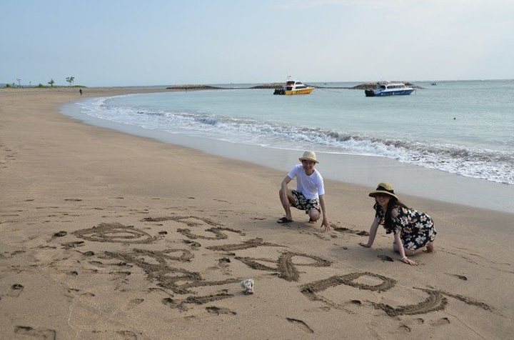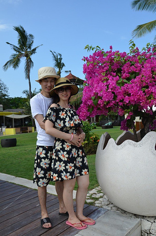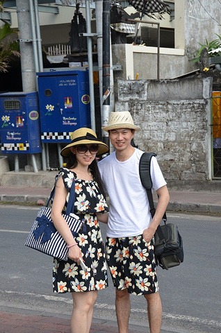 之后就匆匆洗浴完收拾行李check out,去kuta和妈妈们汇合啦。在房间时接到了NANIK的电话,说有包车免费送我们回kuta,问我们几点需要。真是好姑娘呀,服务这么周到,以为check out能见到她,当面表示下感谢,结果终究再没见到。谢谢啦,NANIK! 回到Aston Kuta和妈妈们汇合后,离飞机起飞还有段时间,妈妈看我和老公穿着情侣装,就说我们再去kuta海滩另一边拍拍,真是不错的提议呢!我喜欢!O(∩_∩)O哈哈~