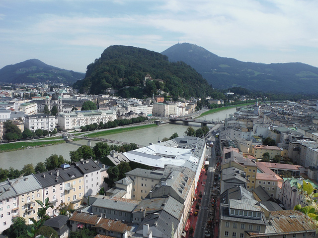 從山上看萨尔兹堡的感覺真的蠻不錯的。這一次來已經搭乘了好幾次不同的缆車, 今天搭乘電梯上來,又有一個新的角度可以俯瞰這個城市。