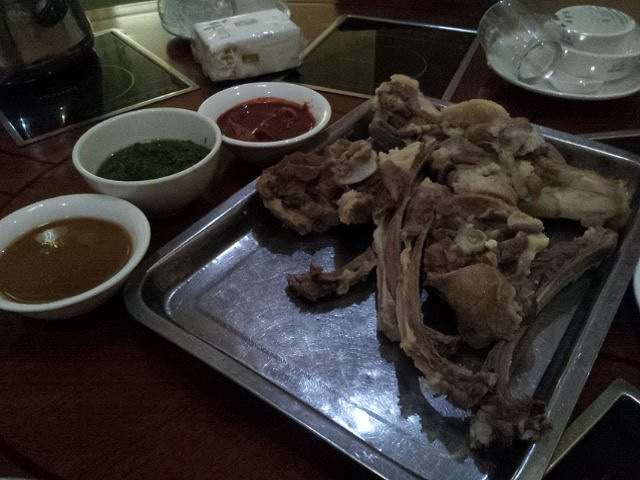 额尔古纳市的蒙古缘饭店,我们深入草原的第一顿正餐却已是下午2点了。既然来到草原就得吃羊肉啊!无奈我们全家牙口不好,这美味的羊肉到了我们嘴里就是咬不动。哎,不怪羊,实在是我家的牙齿不争气啊!