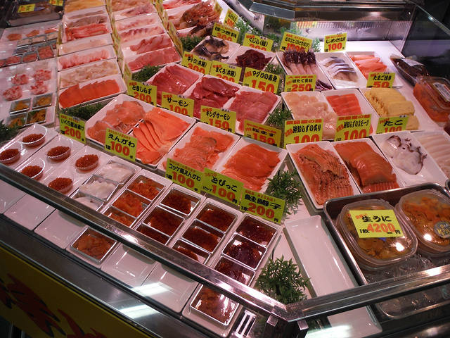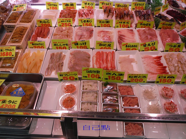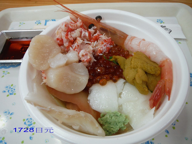 寄放行李後,第一件事就是去和商市場吃勝手丼。日本到处都可以吃到海鲜丼,勝手丼和海鲜丼有什么不一样呢?海鲜丼是固定的份量,也许海鲜很多,但是饭也很多。有时候你并不想吃这么多饭,只想要吃一点饭配很多海鲜就得吃勝手丼。 先去點一碗小碗的饭,再来摊位这边點要吃的海鲜。我点了海胆、干贝、鲑鱼卵、蟹肉、还有不同种类的鱼,总共十几种加上饭才不到两千日元,真的很便宜!
