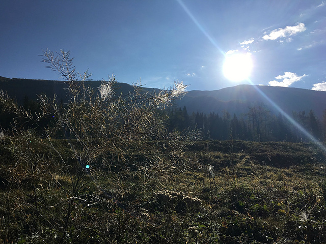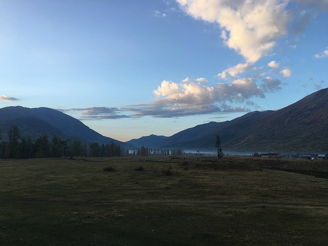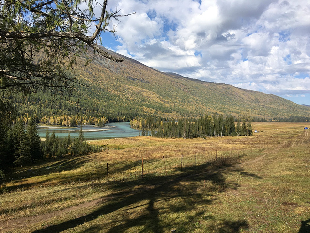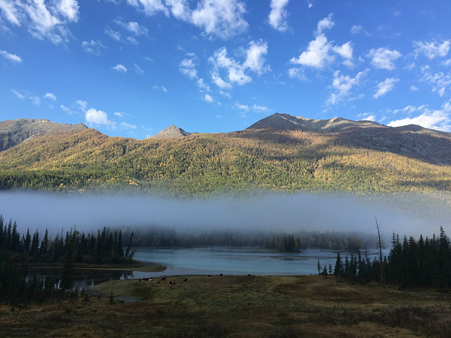 D8 喀纳斯-禾木 早上喀纳斯游三湾,一大早要去神仙湾看晨雾,不过早上的班车比较混乱以至于我们只能从住宿的新村徒步出来,一路景色不错也平复了下糟糕的心情,到达神仙湾的时候正好是晨雾快散的时候,也是如梦如幻很美,那里还有剧组在拍戏拦下了一片区域没法过去。 时间有点赶,路过了月亮湾和卧龙湾,有同行是从神仙湾徒步到卧龙湾的,从底下湖边走可以看到超美的倒影,也是喀纳斯让人印象深刻的,我们走后的第二天喀纳斯就下雪了,所以应该说我们看到了今年的最美秋色,所以觉得运气还不错。 下午到了禾木村,其实也在喀纳斯景区里面,只不过在另一面山头,所以会感觉景色差不多。第一印象并不好因为游客真的很多,而且已经很商业化,没有去骑马,爬了一下小美丽峰,总觉得没太多惊喜。