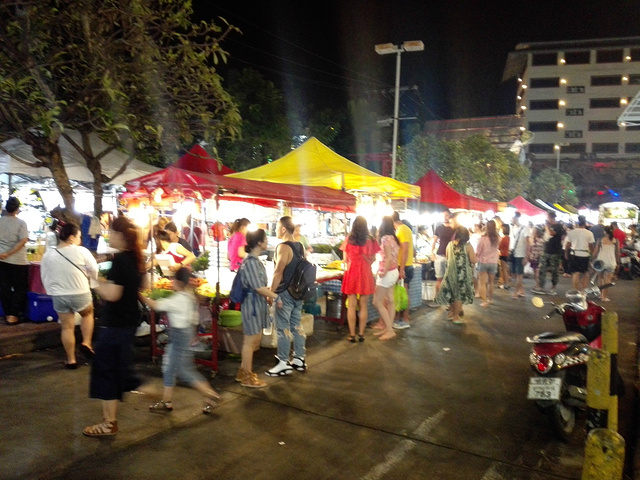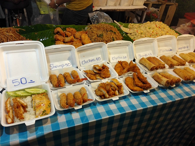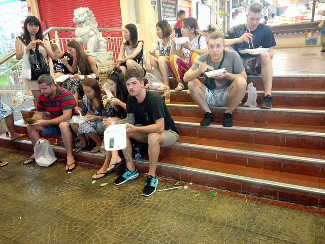 出海的一天是疲惫且饥饿的,等车子把我们送回客栈已经是黄昏时分了,疲惫里面带着饥饿,此时我俩只想好好的大吃一顿,补充点能量,才能更好的应对明日的出海之旅。奈何来普吉岛已经6天了,媳妇一直吃不惯这里的当地口味,每顿都吃不了几口就吃不下啦。所以,我们就又想起了万能神器度娘+各种论坛去收罗当地美食,好在功夫不负有心人,许多游友都提到了一个地方,那就是芭东夜市啦。抱着试一试的心态,我俩在地图上面导航了位置,经过二十分钟的步行,这才找到了地方。其实位置是很好找的,主要是我俩之前路过都没有留意到班赞海鲜市场的位置,这才花了这么大半天的功夫。 我来到这里的第一个反应,就如同进入了一个国际化的路边摊似的,真的是吃货无国界呀,为了美食,各个国家的游客都蜂拥到这里。一串烧烤30B,一杯果汁20B,一碗泰式卤肉饭60B,这么便宜的价格,这么美味的食物,你能想象到200B就把我俩撑了个底朝天吗?如果不是实在吃不下了,我真想一次就吃遍这里的所有美食!