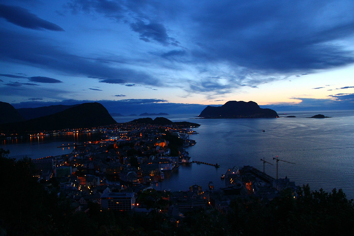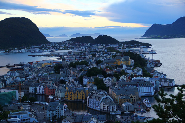 来奥勒松,Aksla山是必游项目,走418级台阶来到山顶的观景点,俯瞰奥勒松全城。如果晚上爬上来看夜景,记得多穿点衣服。 我是直接9点多从旅馆出发上山看夜景的,在山上呆到11点,没能坚持到天完全黑下来,山上人不少。山顶的收费观景台+咖啡厅(门票好像是10Nok)晚上八点就关门,不过到了山顶往里走走,也能找到好的视角。