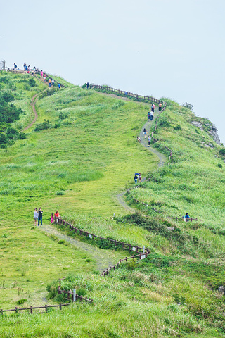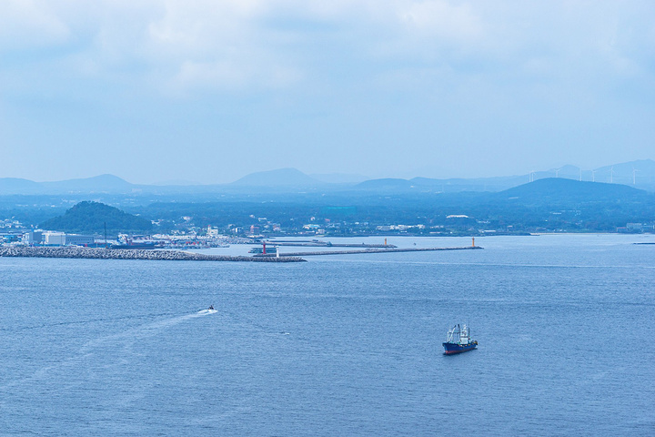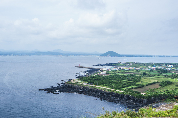 登上山顶后就可以俯览整个济州岛的海景了。山的对面就是济州岛。