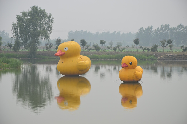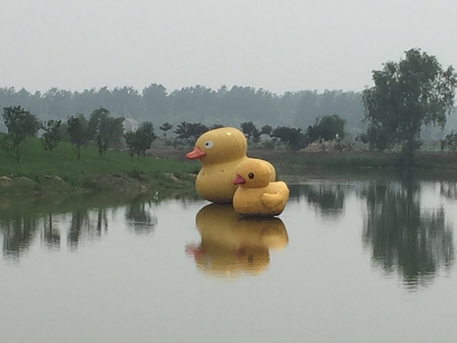 两只小黄鸭呆呆的漂在那里,小鸭子很显然不是打鸭子的,应该是隔壁老王的