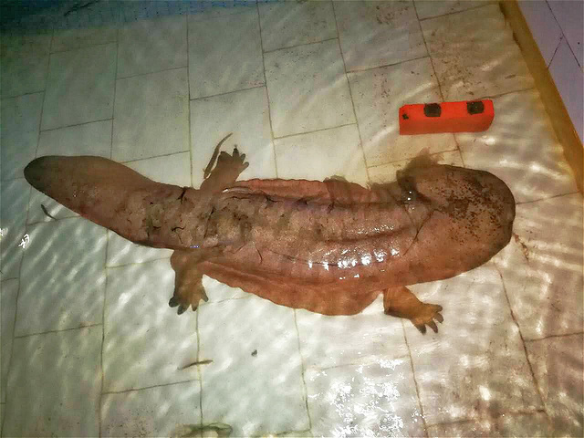 这只娃娃鱼据说有两百多岁,和砖头做个参照……