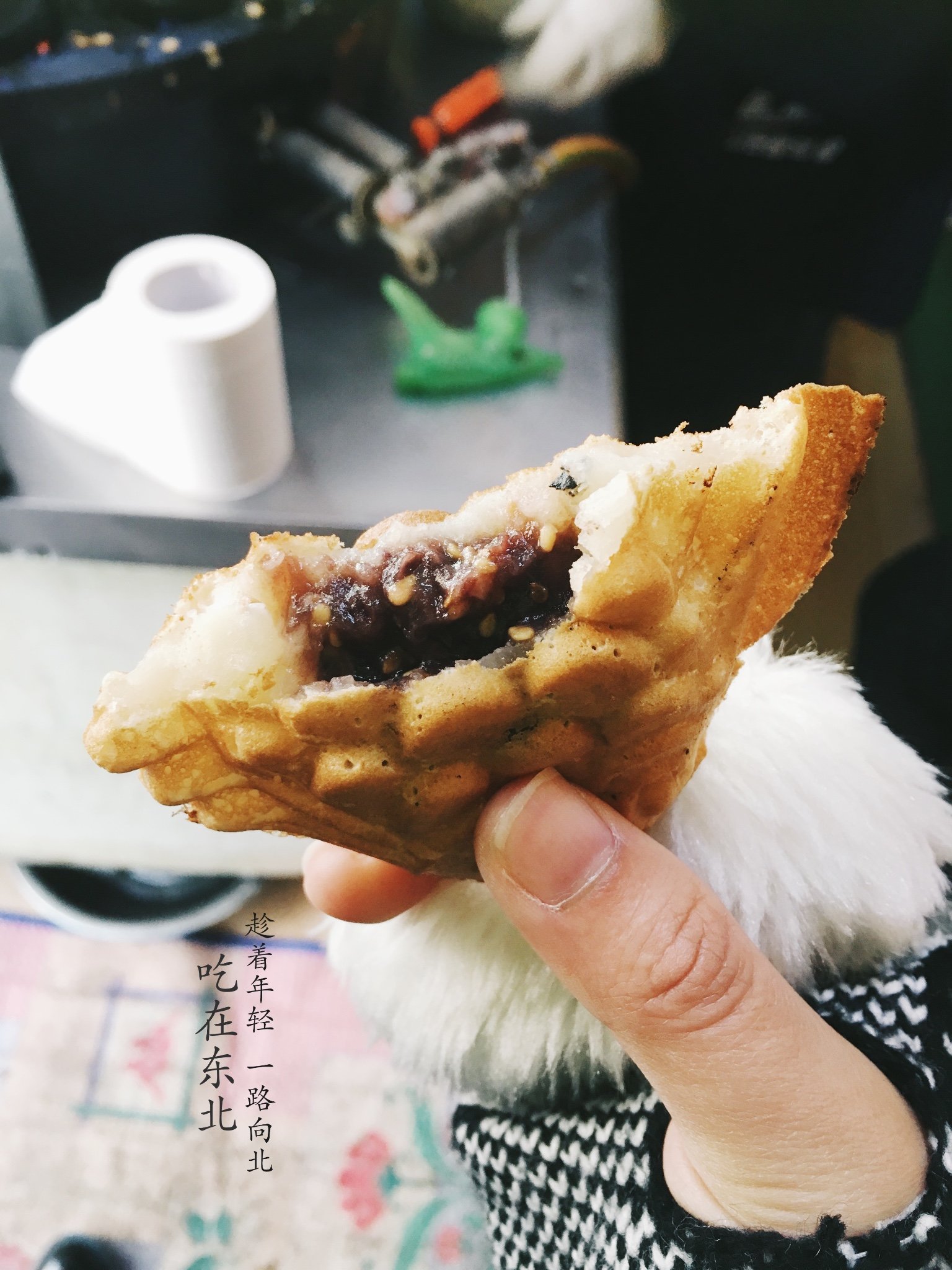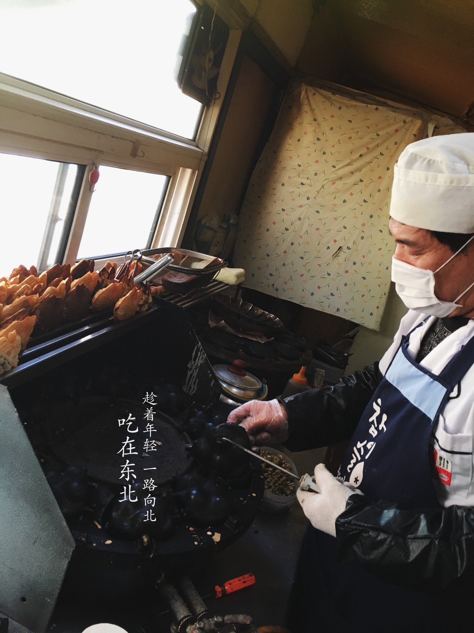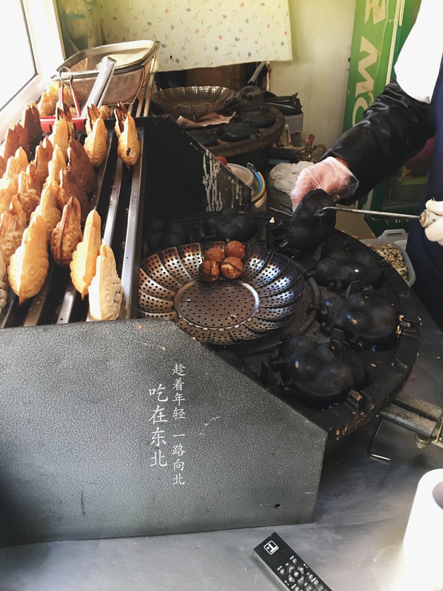 老板是个朝鲜族的大叔,非常热情!一到店门口就招呼我们进入基本只能容纳四个人的店铺,一人一个鲷鱼烧一个核桃饼先吃着,时间不急的话就等他现做,我们还有时间所以一边唠着一边等。