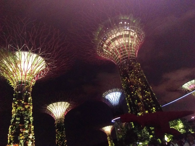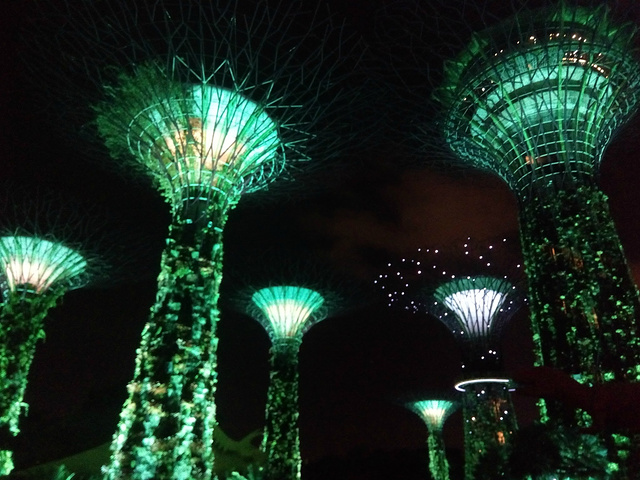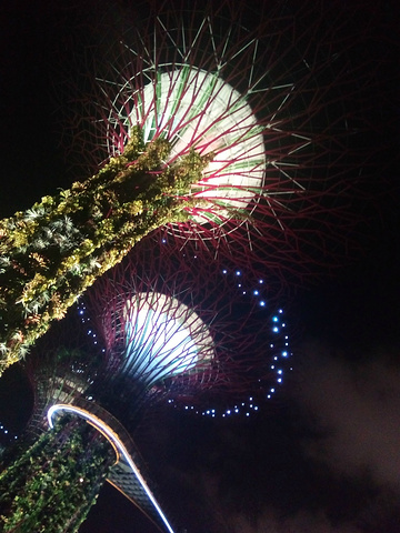 下午大概四点,我们便回到Vivo City前往滨海湾花园。滨海湾花园位于金沙酒店对面,门票实免费的,但是如果你想乘电瓶车或者参观云雾顶和花穹便要买票,云雾顶和花穹现场票价为S$28,我们上某宝买一共79人民币。 花穹和云雾顶都是冷室,短衣短裤的我们虽然都多备一件长袖外套,但没顶住那个冷啊!冷室还原了热带山地地区凉爽潮湿的气候和地中海及半干旱、亚热带地区凉爽干燥的气候。这些地区都是世界上最受威胁的栖息地,许多植物物种面临着人类活动造成的气候变化和栖息地破坏的威胁。植物种植数量约8.7 万柱,包括400种类(百度百科)。 花穹比云雾顶更多植物看,大概是因为女人都爱花吧,刚过完春节的我们,来到这么一个高级的花园,很是欢喜,潮奶们争相与各种艳花影相。当晚花穹里的餐厅还有新人设喜酒宴。相反,云雾顶没有花穹那么好看,一进入门口被擎天大瀑布冷着了。令我感兴趣的是云雾顶里面那些奇离古怪的雕塑和植物,乐高版的猪笼草、老人与龙的雕塑、铜制的大丽花……另外云雾顶还有六层高的栈道,畏高者慎走。由于我们还没吃饭,走这条路的时候都两腿发软了。我们天真地以为我们购的门票包括OCBC SKYWAY的门票,所以我们匆匆走完云雾顶便直奔擎天树,谁知去到那里被告知我们的门票不包括OCBC,但已经停止售票。 擎天大树是高度介于25 至50 米的树形结构。这些独具一格的垂直花园通过垂直展示擎天大树。擎天大树的热带攀缘植物、附生植物和蕨类植物,制造令人惊叹的元素。这18 个树形结构的建筑从热带雨林中的优势树种中汲取灵感。它们将成年树的外形和功能相结合,不仅可支持植物的生长,还能通过具备环境可持续性的特征模拟树木的生态功能。擎天大树的部分“树冠”安装了光伏电池,可吸收太阳能,供夜间照明,其他“树冠”则与植物冷室系统相连,作为排气口。 擎天大树的“树冠”白天可以遮阴。入夜,五彩灯光和投射多媒体将这座垂直花园打扮得妖娆多姿。两棵擎天大树之间有空中步道相连,方便游客从不同的 角度欣赏滨海南花园的美景。(百度百科)Anyway, it is very great if you get a chance to stand up there to view the whole scenario of the Garden. 当晚我们进了港湾站买票时被排队的人惊呆了,所有我们打算买two-day pass,但由于每种pass都是即买即用,无论什么时候买,以第一次行程开始,以最后一次行程结束,我们觉得今天只能用一次便浪费了一天的旅费,于是我们傻傻地买了EZ-LINK,S$5押金不可退,有五年有效期,最低充值S$10!还有卡内若余额不足是不能进站的。