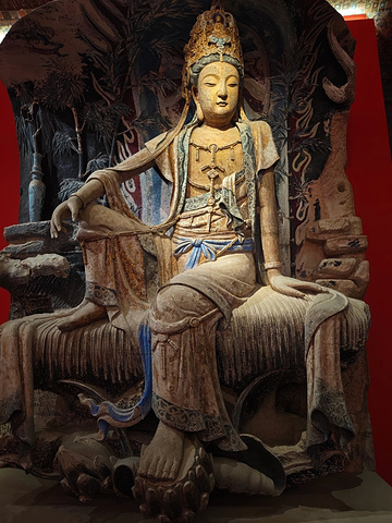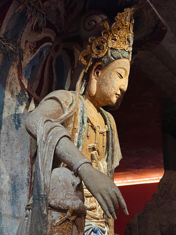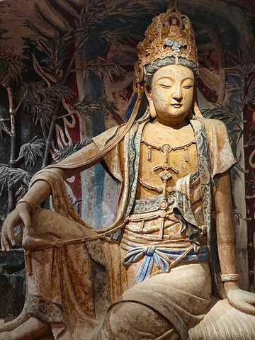 安岳毗卢洞|绝美紫竹观音的一些细节 |||第一次见到这尊紫竹观音,是在国博的『盛世修典』大展上的3D打印版,第一眼惊艳,无法自持。很快就安排了安岳行,飞到重庆,一人一车经大足至安岳。 · 说实话,真正看到实物,反而没有最初的惊艳,有种明珠蒙尘之感 感觉国博版更多一分丰腴和笑意,面容似乎更漂亮一些,但又少了很多温度。另外就是受空间限制,国博陈列位置较低,见到实物才知道原来还是挺高的。 · 当然,原作是匠人绝妙的创作和高超的技艺,而国博版是使用新科技进行复制、保存的一种尝试,也让我们看到另一种文保的手段和可能。 · 安岳毗卢洞的这尊观音像为水月观音,因背景中有竹子,民间称其为紫竹观音(又因为右腿翘起踩于座上,也称翘脚观音)。 · 我的《看懂大足石刻》系列也写过水月观音,是在中国文化背景下创造出来,也非常符合中国人审美的一种观音形象,川渝地区水月观音信仰一度盛行。 · 最漂亮的水月观音,当属榆林窟2窟的两铺壁画,而石刻造像可以做到如此精美细腻,着实令人赞叹❗️宝冠、璎珞和手部的细节,观音怡然自在的体态,流畅垂坠的裙摆和披帛,水从石座上流下的纹路,让我如痴如醉❤️。 ·