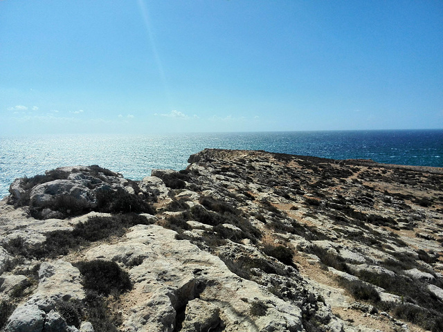 Instead,我强烈推荐你走到卖萌村的对面的Anchor's Bay。首先,你将会从对岸一目了然地看到整个乐园的全景。然后沿着海边往南走,置身于一片充满蓝窗+Dingli Cliffs即视感的广阔空间,走过被海浪拍打的礁石……就是喜欢这种天地无限的感觉!