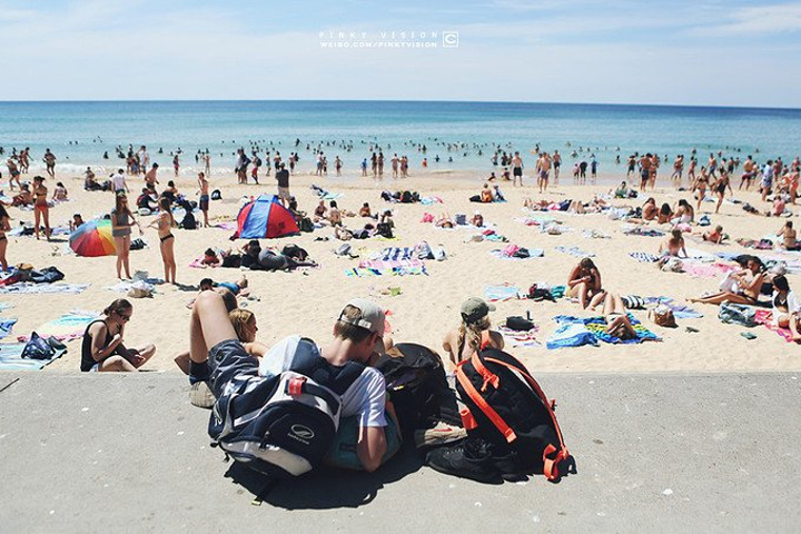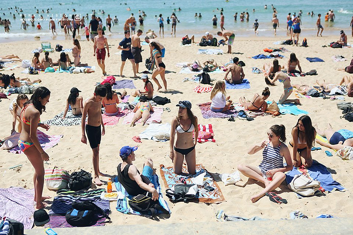 到达海滩边,映入眼帘的是满满的人,这着实吓着我了,实在是没想到,这边的海滩能聚集这么多人,这在北戴河叫煮饺子,我那年是去的Bondi,人要比这里少2/3,并非不是季节,那是12月初,比现在还要夏天。