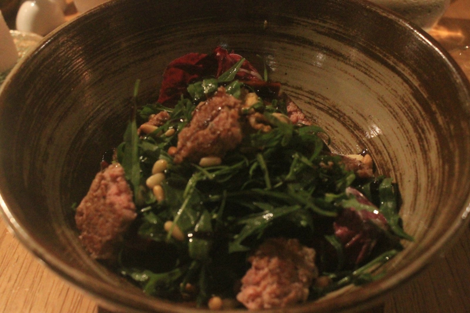 前餐推荐 Insalata di rucola con salsiccia,食材之一意大利香肠是空运过来的,口感极好,有微微松香的气味。