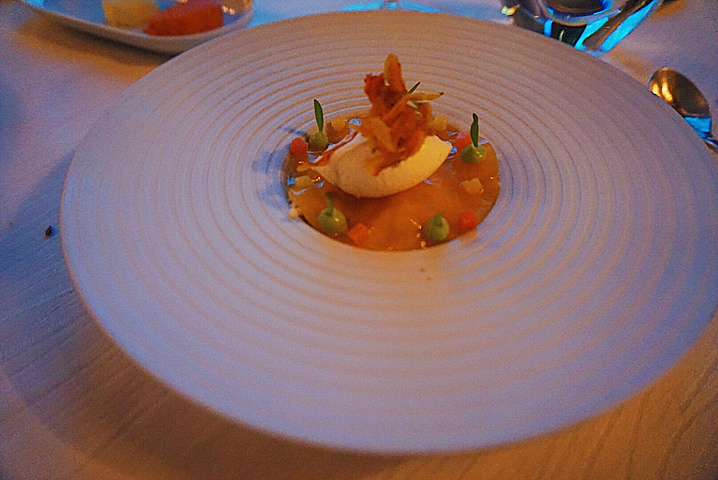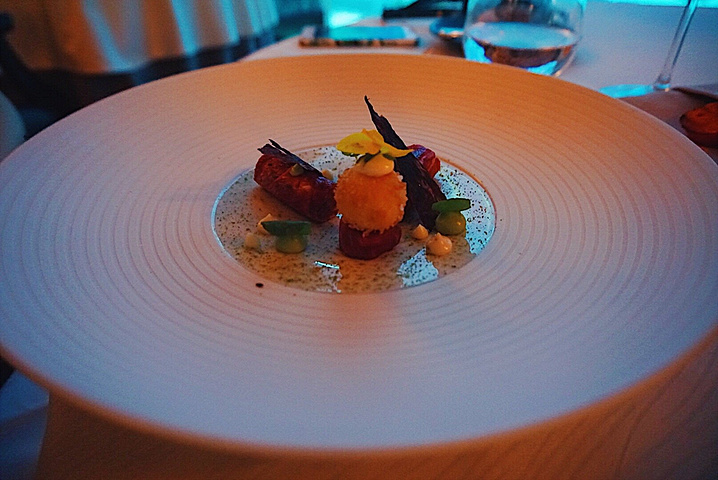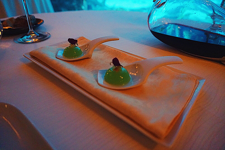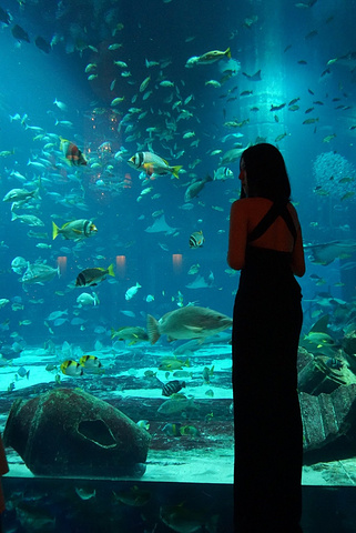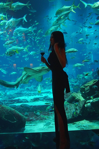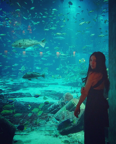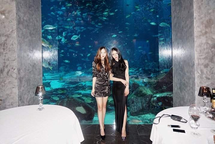 玩好之后回房间洗澡换衣服,然后我们就去吃完饭咯。一个月前订酒店时就预定了这家海底餐厅Ossiano,当时餐厅说没有鱼缸边的位置了,闺蜜发邮件说是我过生日才订到的~ 我们点了5道菜的set menu,不包括酒水和服务费是 AED785 一个人。别看没到菜的量好像很小的样子,两个人从8点吃到12点吃的肚子都快爆炸了。餐厅本身的评价就很高,获得连续四年迪拜最好的海鲜餐厅和许多奖项。食材很新鲜,味道很不错,吃着饭看着成群的鱼在面前的感觉超棒。