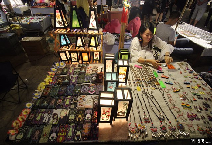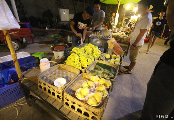 特色的美食样样不少 无论南北江边总是那么热闹,酒店对面就是景洪夜市,到了晚上自然要去凑凑热闹,逛夜市不是主要目的,夜市在澜沧江边,到了晚上这里会格外的凉爽,江面上微微的暖风吹走了热带版纳的闷热。漫步在澜沧江边,听着夜市的喧嚣,酒吧街传来动人的歌声。