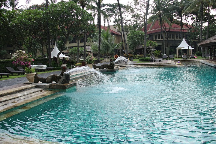 巴厘岛洲际给我印象最深还是他的当地风情建筑与现代化的结合。作为度假地,泳池是一个特别明显的标志。巴厘岛洲际有6个泳池,一直到现在我儿子都认为巴厘岛是最好的地方,因为有6个泳池可以选择。