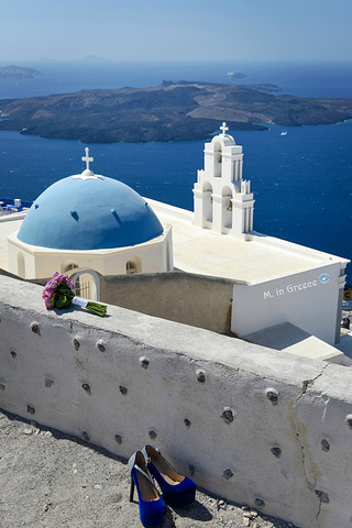 圣岛上有许多蓝顶教堂,但上了《国家地理》杂志封面而蜚声海内外的蓝顶教堂只此一座。明信片的拍摄视角其实是在一处停车场,寻找也需颇费一番周折,好的角度早已被几对拍婚纱的情侣占住,只能耐心地等他们拍完。还好,有爱琴海的美景作伴,即使等待也不会觉得漫长。最适合的拍摄时间是正午时分,这时的蓝顶教堂没有阴影,天蓝得温柔,海蓝得深邃,背后的锡拉火山更是清晰可见,这是一个用尽了世界上所有蓝色的浪漫地方。