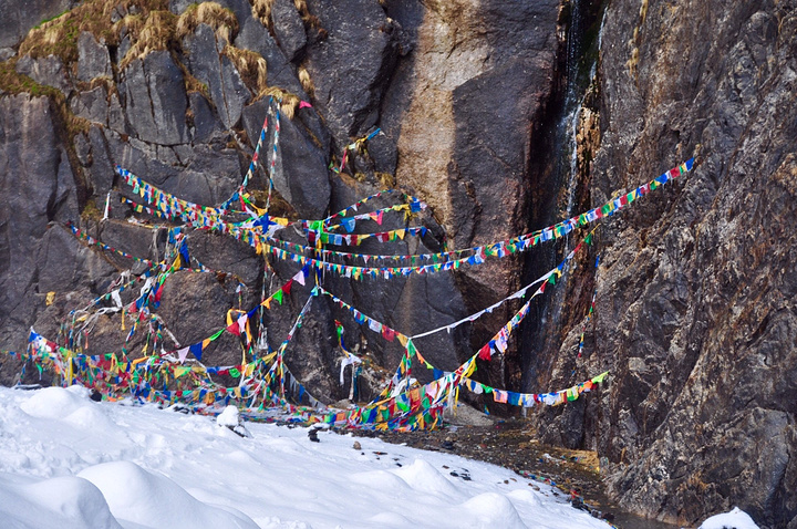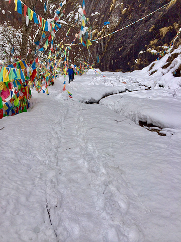 神瀑终点处有一段S形上坡路,此时被雪覆盖得极深,深到转眼就看不见前面人的脚印。美得窒息,我爬得也快窒息,深一脚浅一脚,走两步摔一步。 踉跄上至最高处,眼前山石岩壁垂直伫立,结满冰雪,可惜无法靠近,悉心观摩方看清神瀑的水流,细若游丝,蜿蜒滴淌,感觉完全不能称之为瀑布啊!这净化心灵的神瀑之水,却无缘一亲芳泽,甚是可惜。 想象盛夏丰水时节,立于神瀑之下,神水淋于发肤,又一饮开怀,真是妙哉幸哉。
