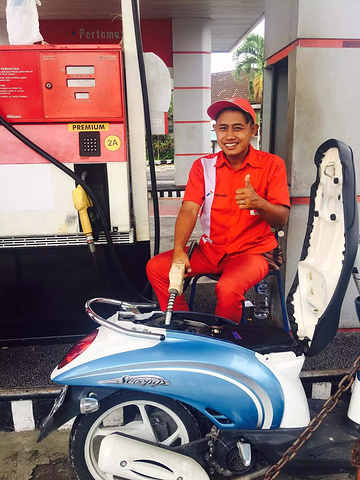 早上在青旅吃了免费早餐,想要租摩托车环游巴厘岛,问我有没有国际驾驶证,我没有,但我表示我会骑摩托车,骑的还不错,我花了60000印尼币租了一辆摩托车,花了10000加油,在狭窄的街道穿行,跟着导航来到海神庙