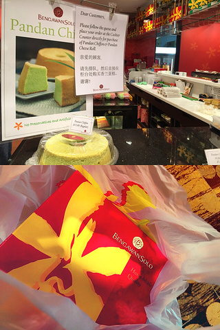 BENGAWAN SOLO在樟宜机场的三个航站楼都有分店,我们来的这家是T1航站楼,入关之后左转直走的右手边就是,还蛮好找的。 据说这里是新加坡最受欢迎的蛋糕店,主打糕点饼干,包装精美,是不错的伴手礼。新加坡出名的香兰绿蛋糕就在这里买啦,直接排队在柜台处购买就可以了,13.8新币一个,凭登机牌还有小折扣哦!