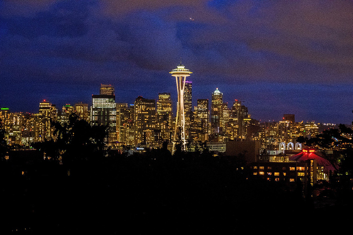 最后一站凯瑞公园(47.629540,-122.359960),这里说是公园,可其实就是一个观景台,甚至街对面就是西雅图的居民区。但是在这里能看到西雅图全景,特别是以太空针为首的市中心区域,如果你的运气够好,万里无云的时候还能拍到远处的雷尼尔雪山,最适合的拍摄时间是黄昏之后。