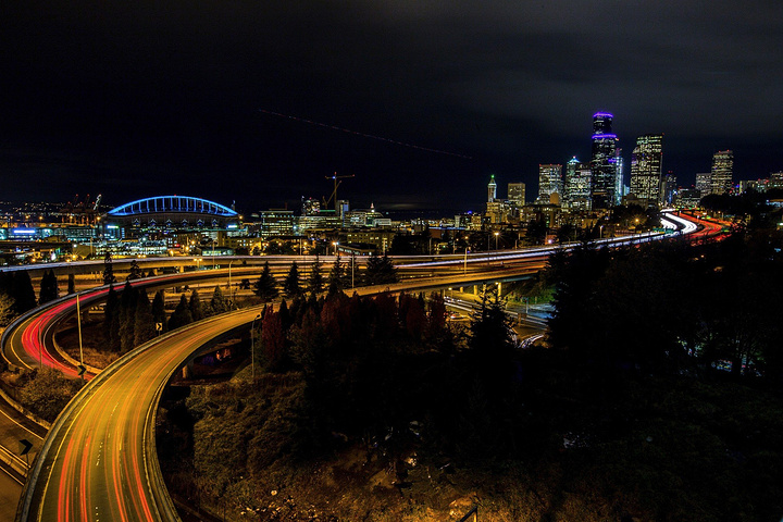 最后一站是12号大街(47.594807, -122.317258)照西雅图夜景,刚去的时候还碰上一个美帝的小年轻也在拍照,不过晚上的西雅图脾气太坏,没有10分钟,又召唤一场小雨把我俩打发走了